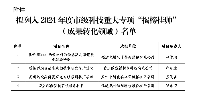 关于2024年度市级科技重大专项“揭榜挂帅”(成果转化领域)建议立项结果的公示